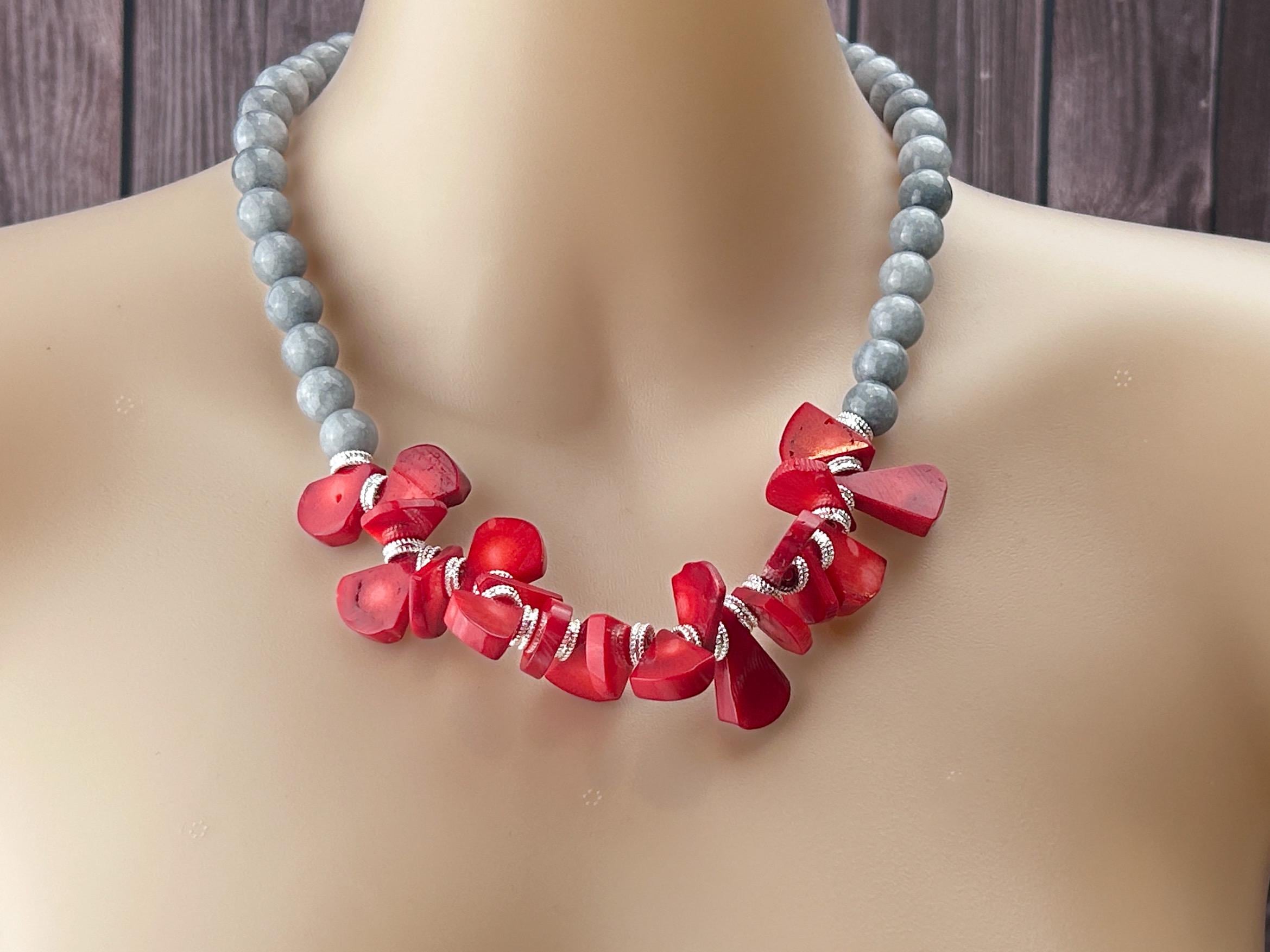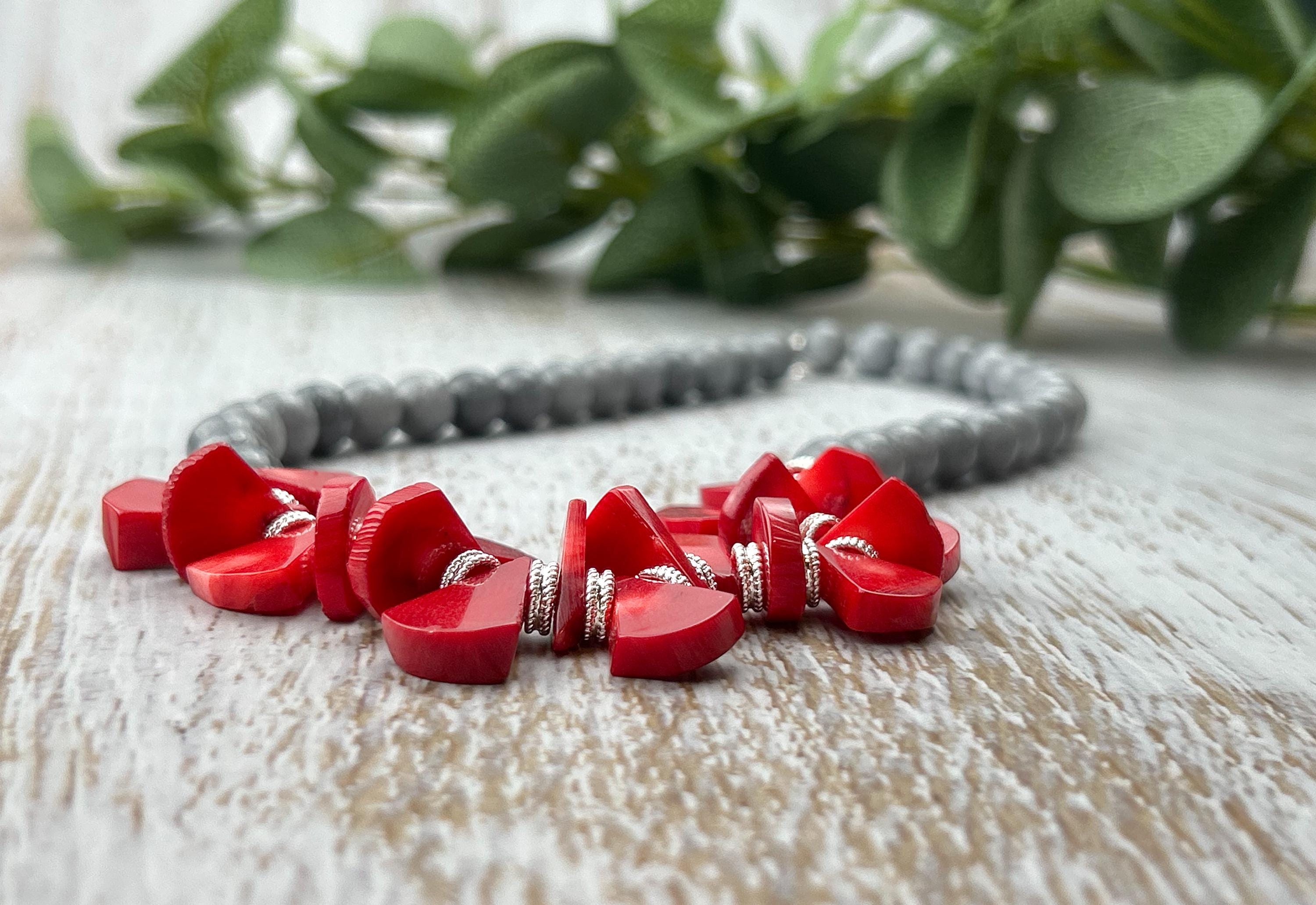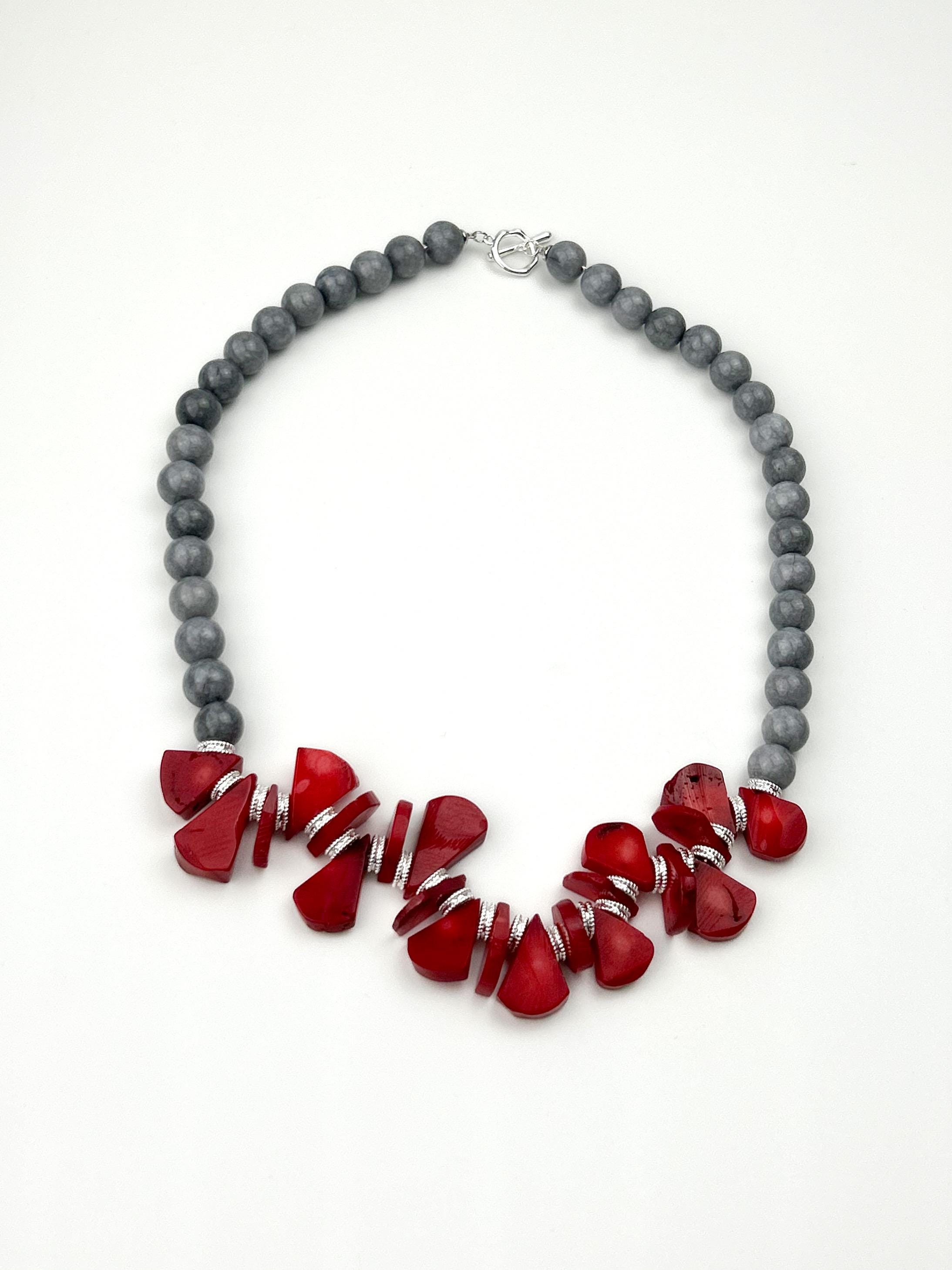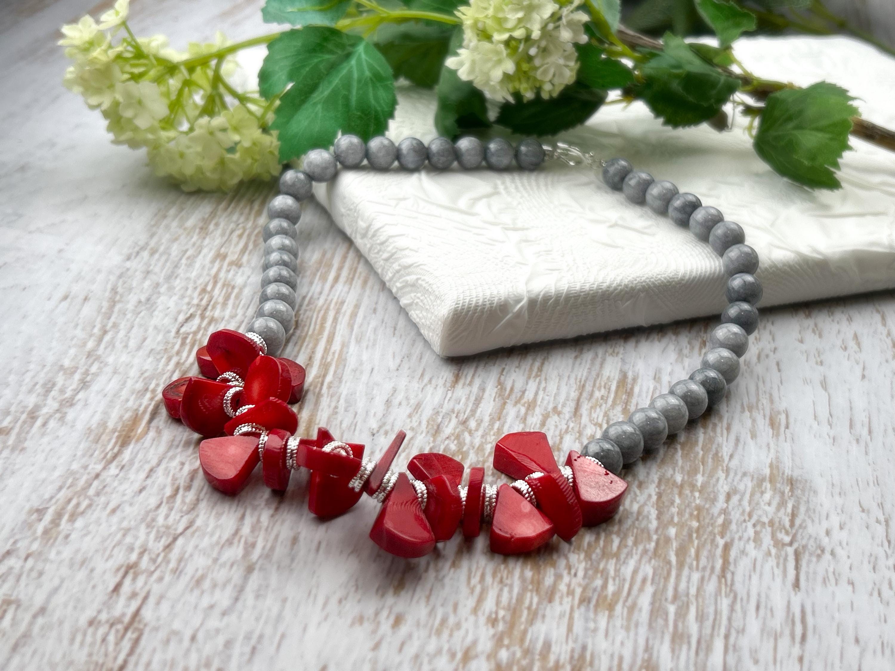 Make a bold yet elegant statement with this handcrafted gemstone choker ❤️🩶 Designed from smooth grey mountain jade and vibrant red coral beads, this piece beautifully balances earthy sophistication with a pop of lively color. Its natural tones and high-quality craftsmanship make it a versatile accessory — perfect for everyday wear, layering, or enhancing your boho chic look.