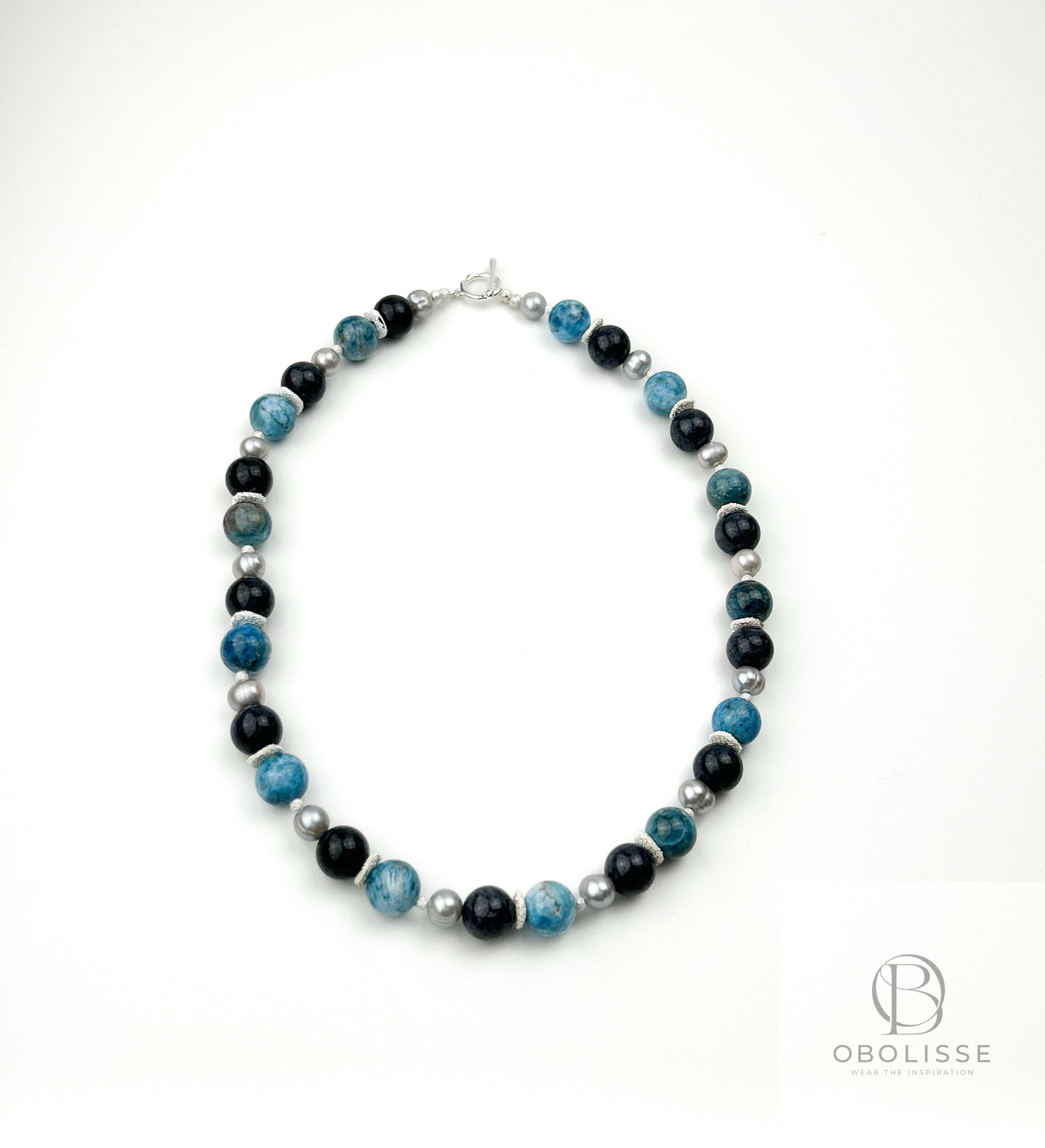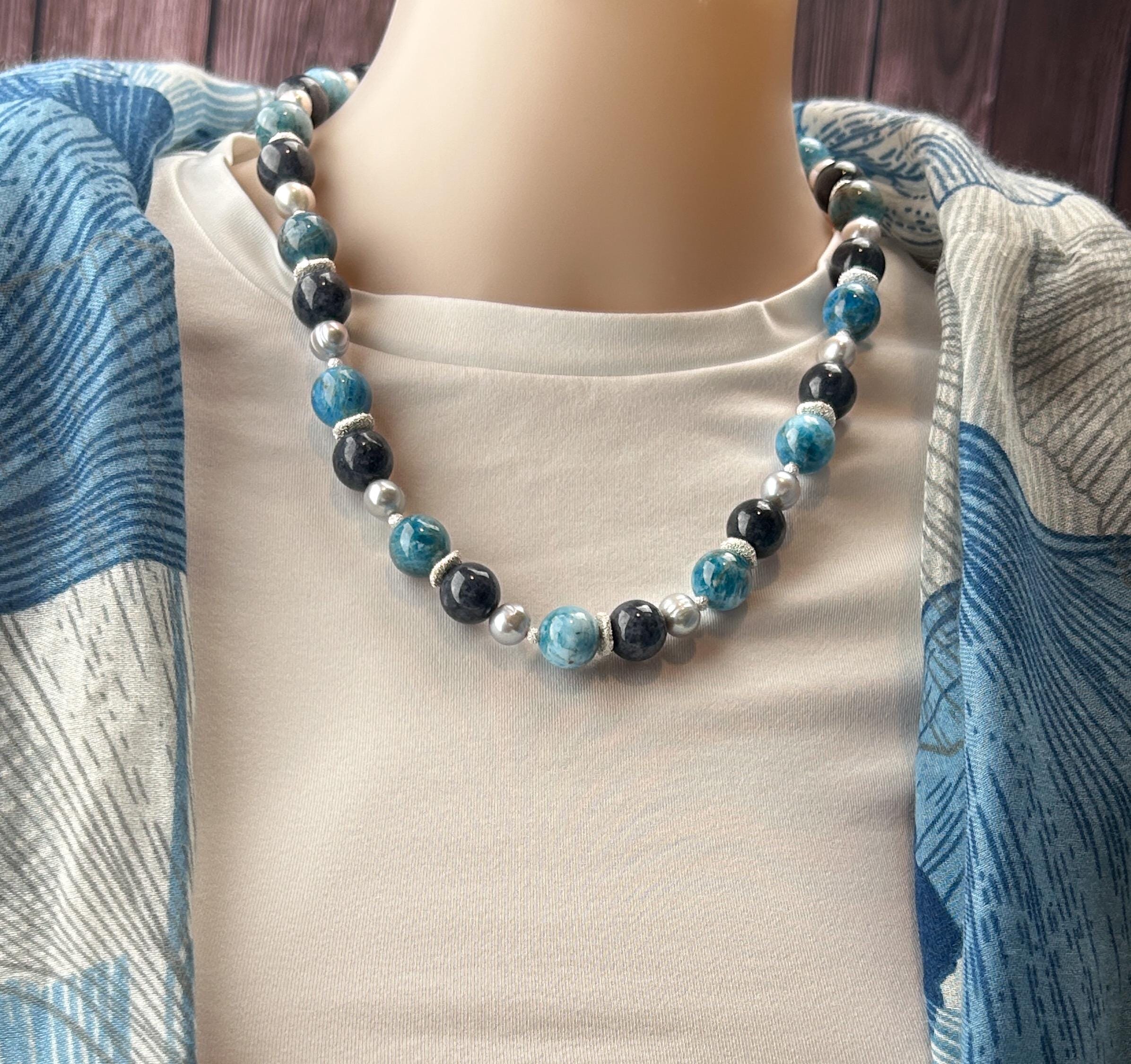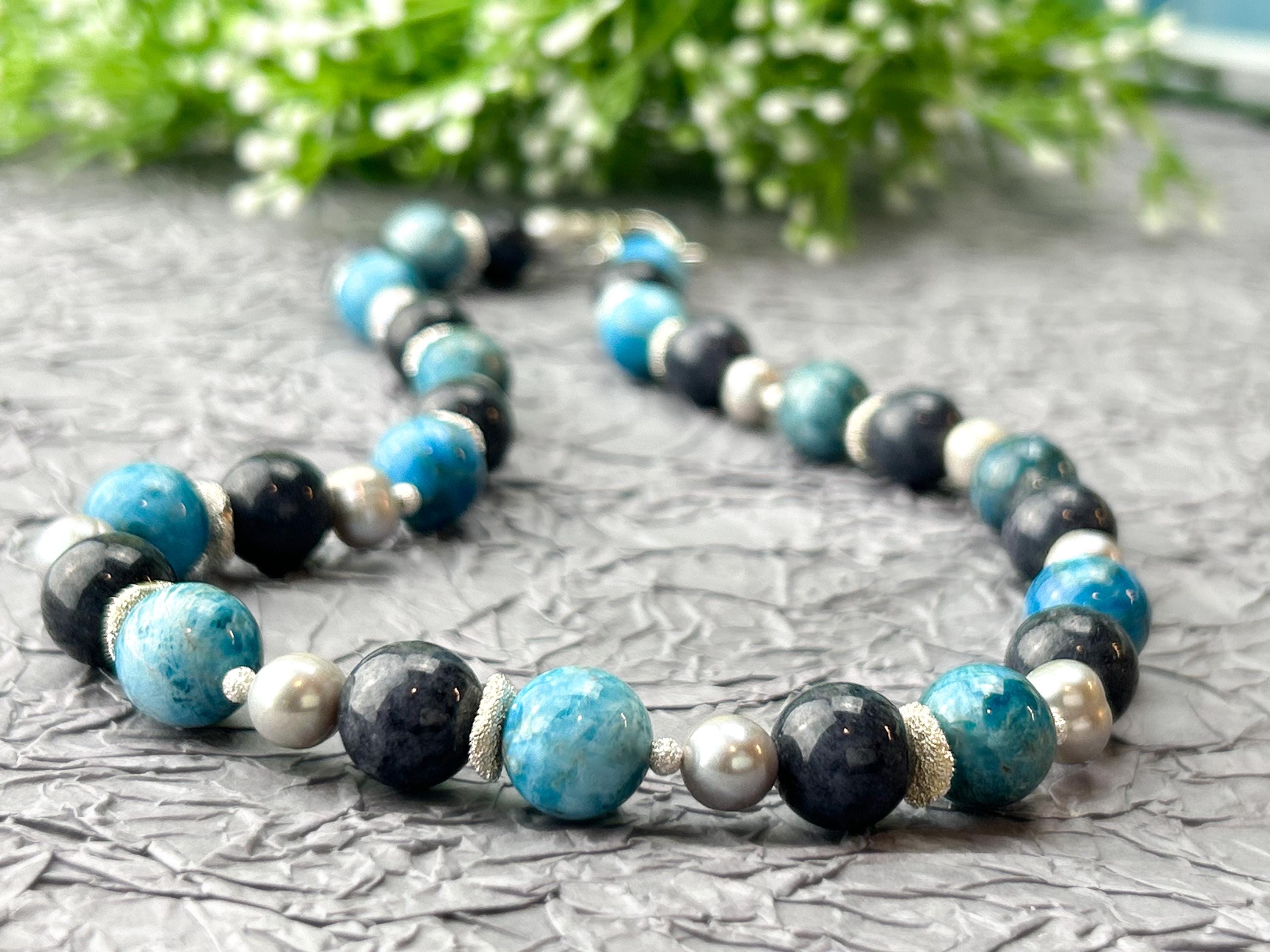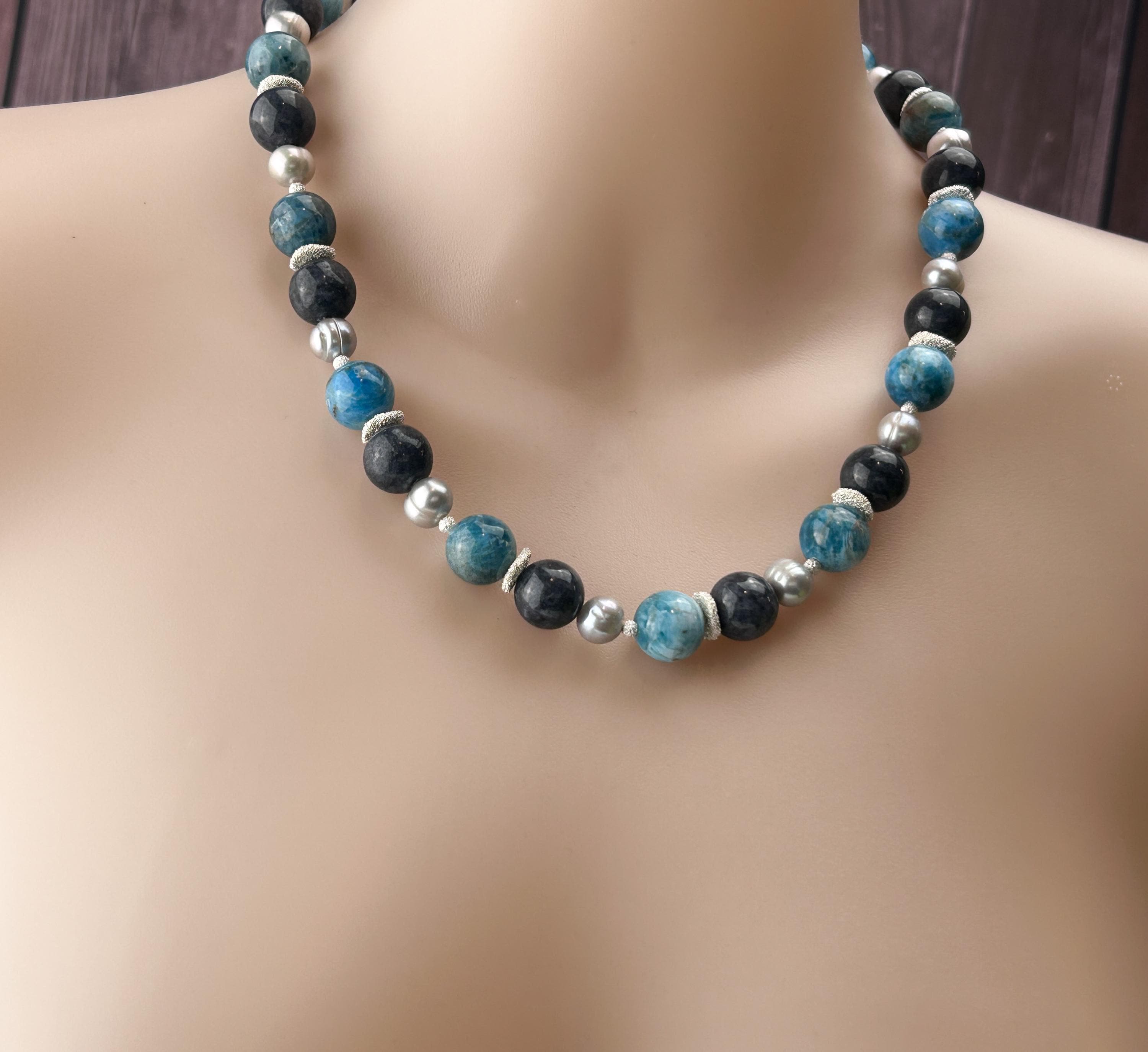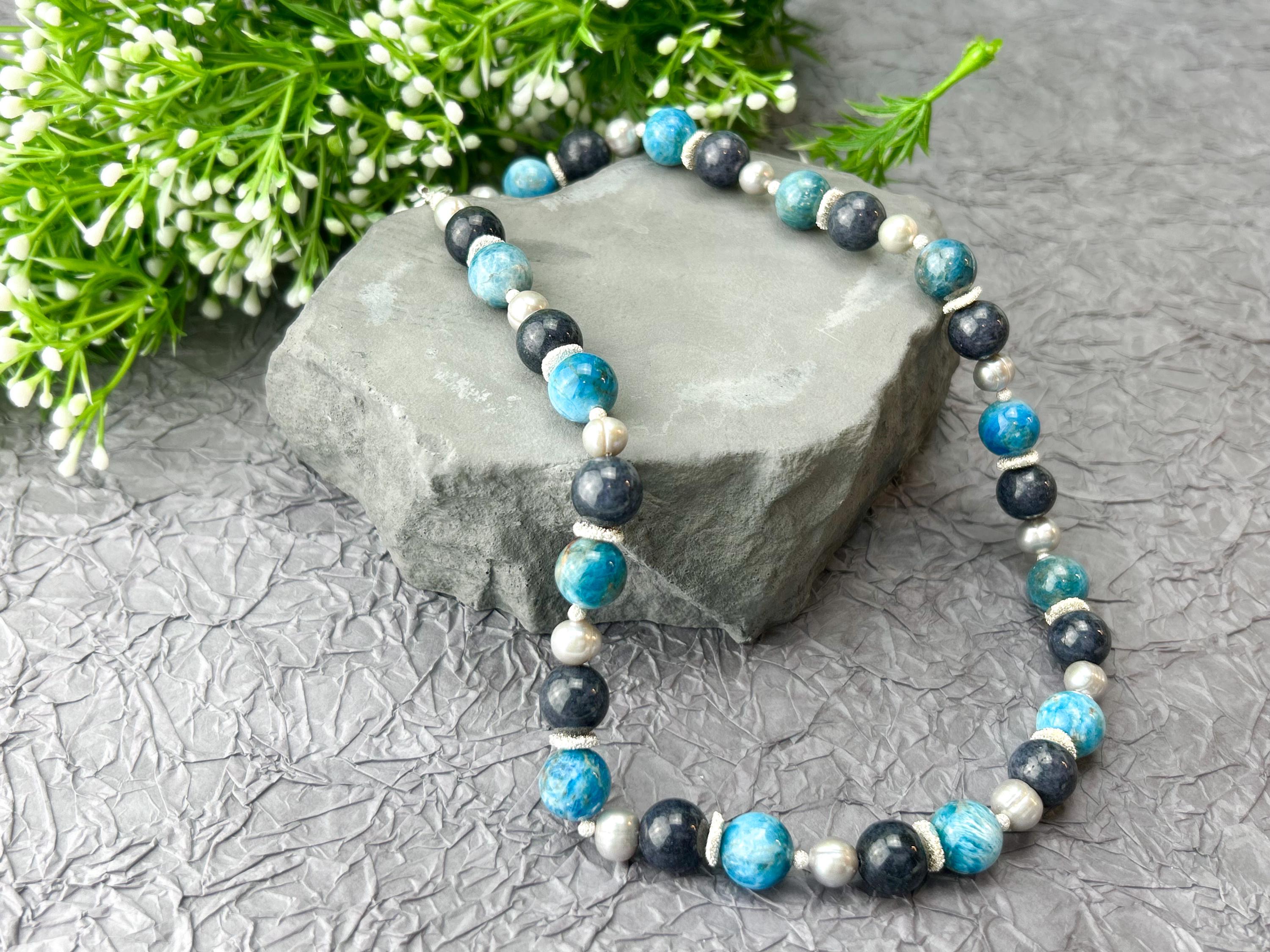 This teal blue apatite, grey pearl, and dark grey jade necklace is an elegant gemstone choker designed for everyday sophistication. The striking contrast between deep teal blue and soft grey tones creates a modern yet timeless boho-inspired necklace. Perfect for layering or wearing alone, this piece adds subtle color and elegance to any outfit, making it a beautiful birthday gift or everyday jewelry accessory. ✨