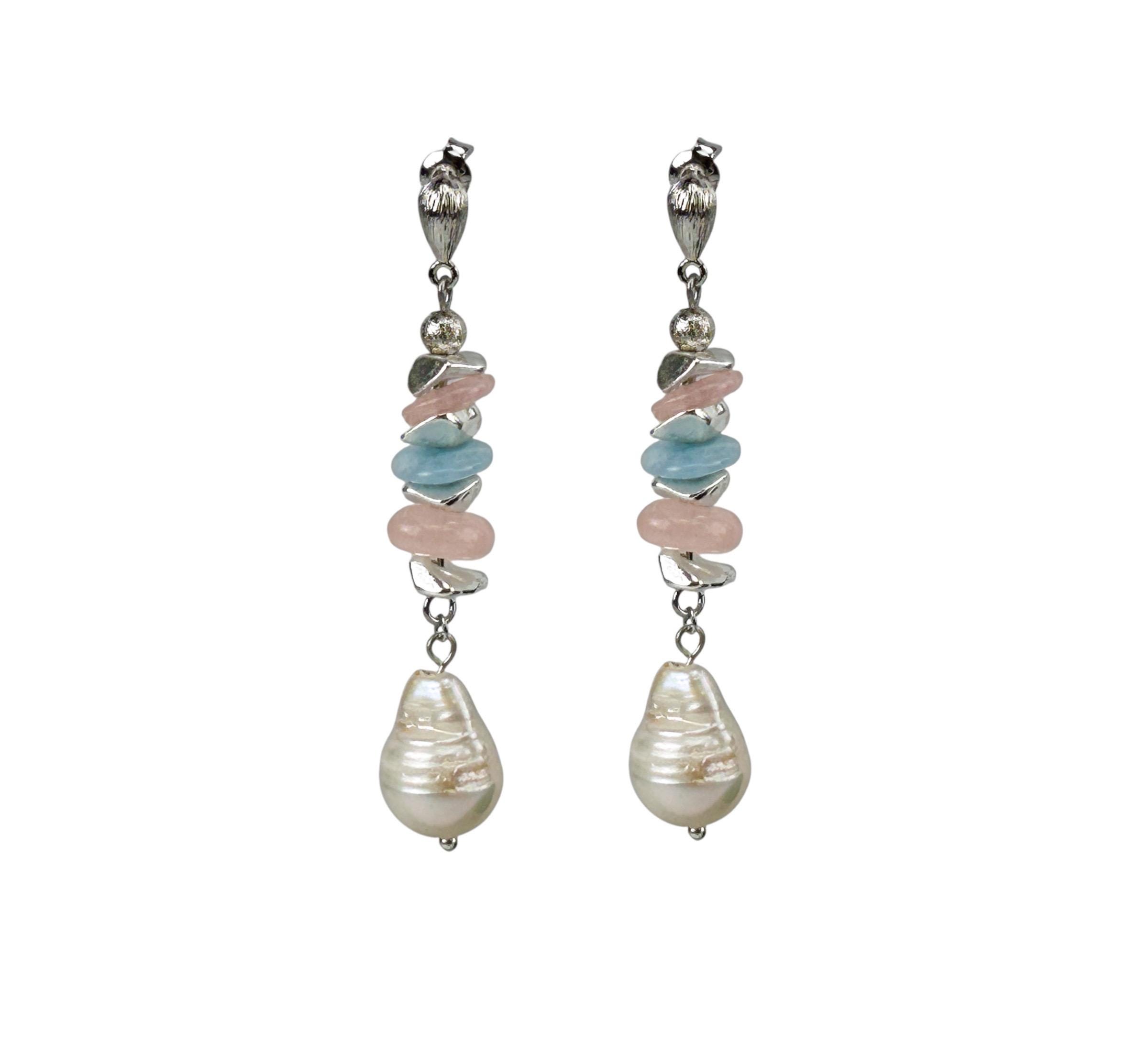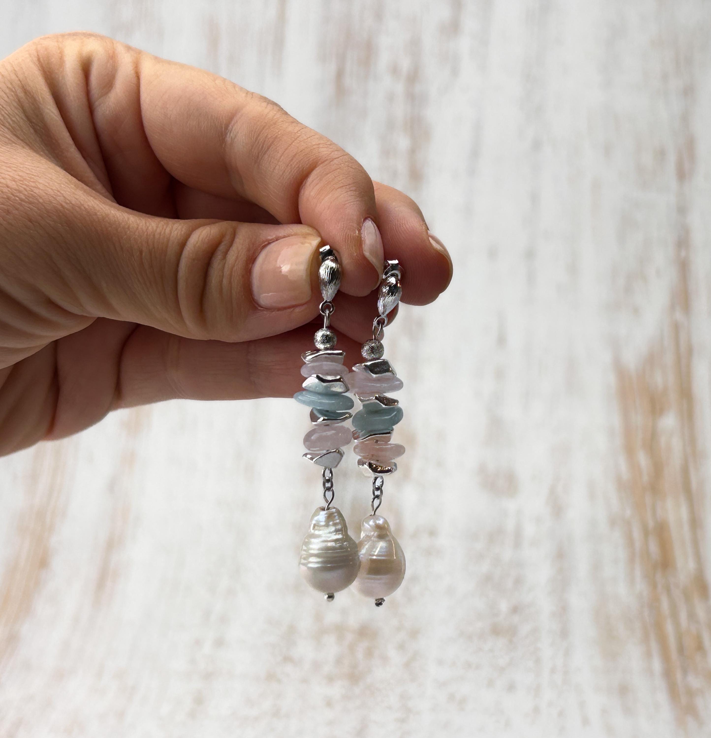 Radiate soft sophistication with these dreamy aquamarine, morganite, beryl and baroque pearl earrings 🌊✨ Handcrafted from genuine gemstones, each earring beautifully blends oceanic blues, blush pinks, and the natural luster of freshwater pearls. Designed with hypoallergenic sterling silver studs, they’re perfect for sensitive ears and offer an elegant dangle that transitions effortlessly from day to evening. A timeless piece that captures the essence of boho elegance and refined femininity.