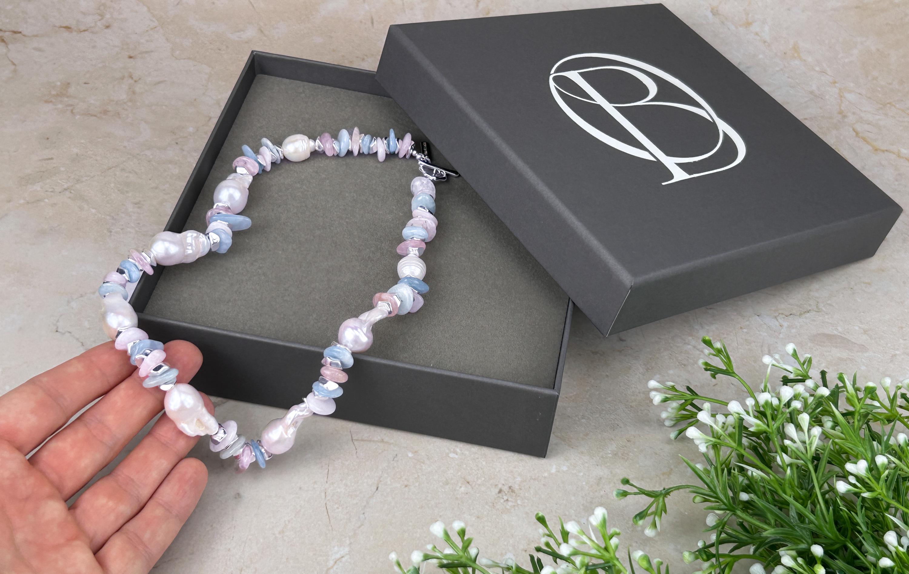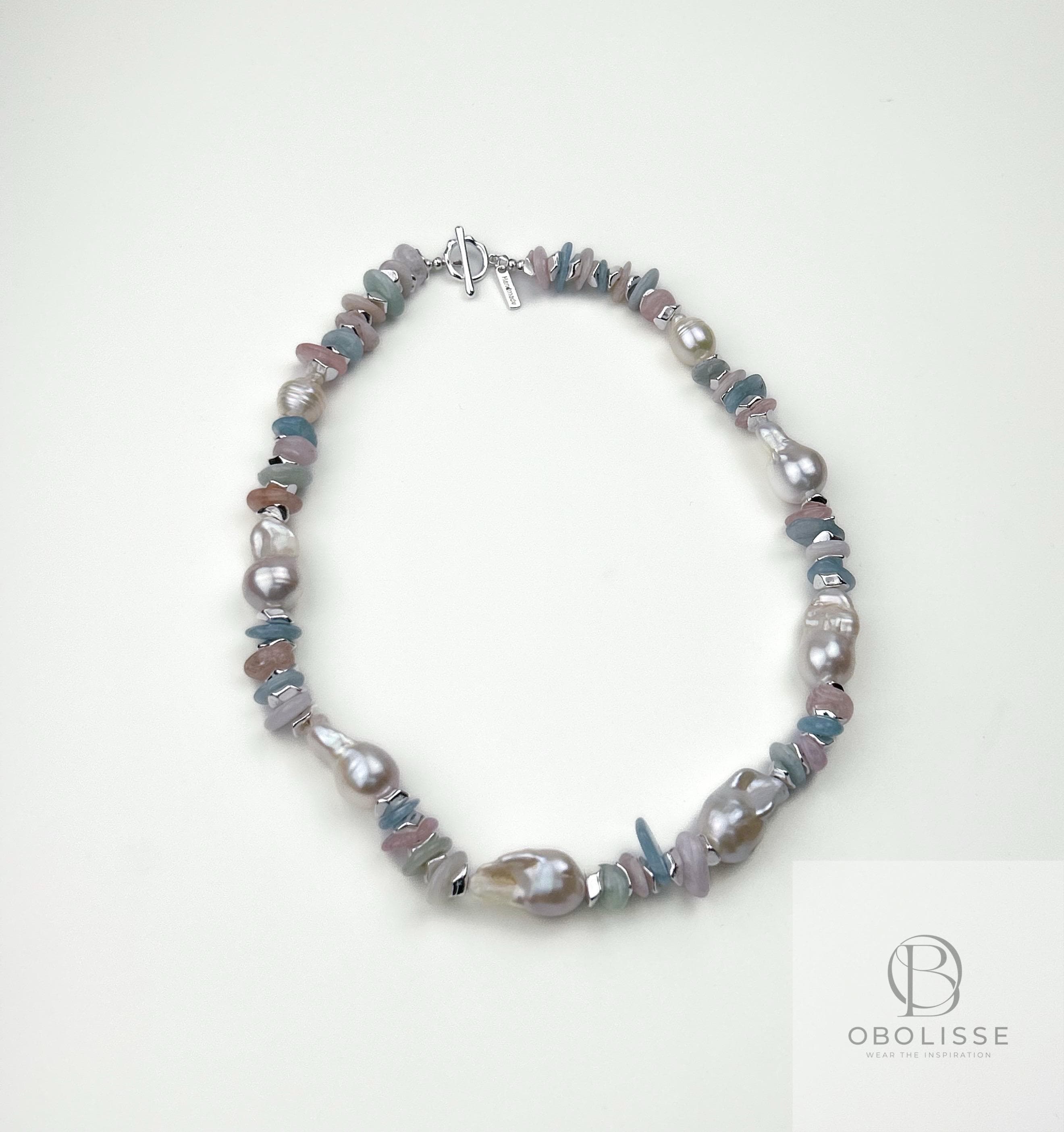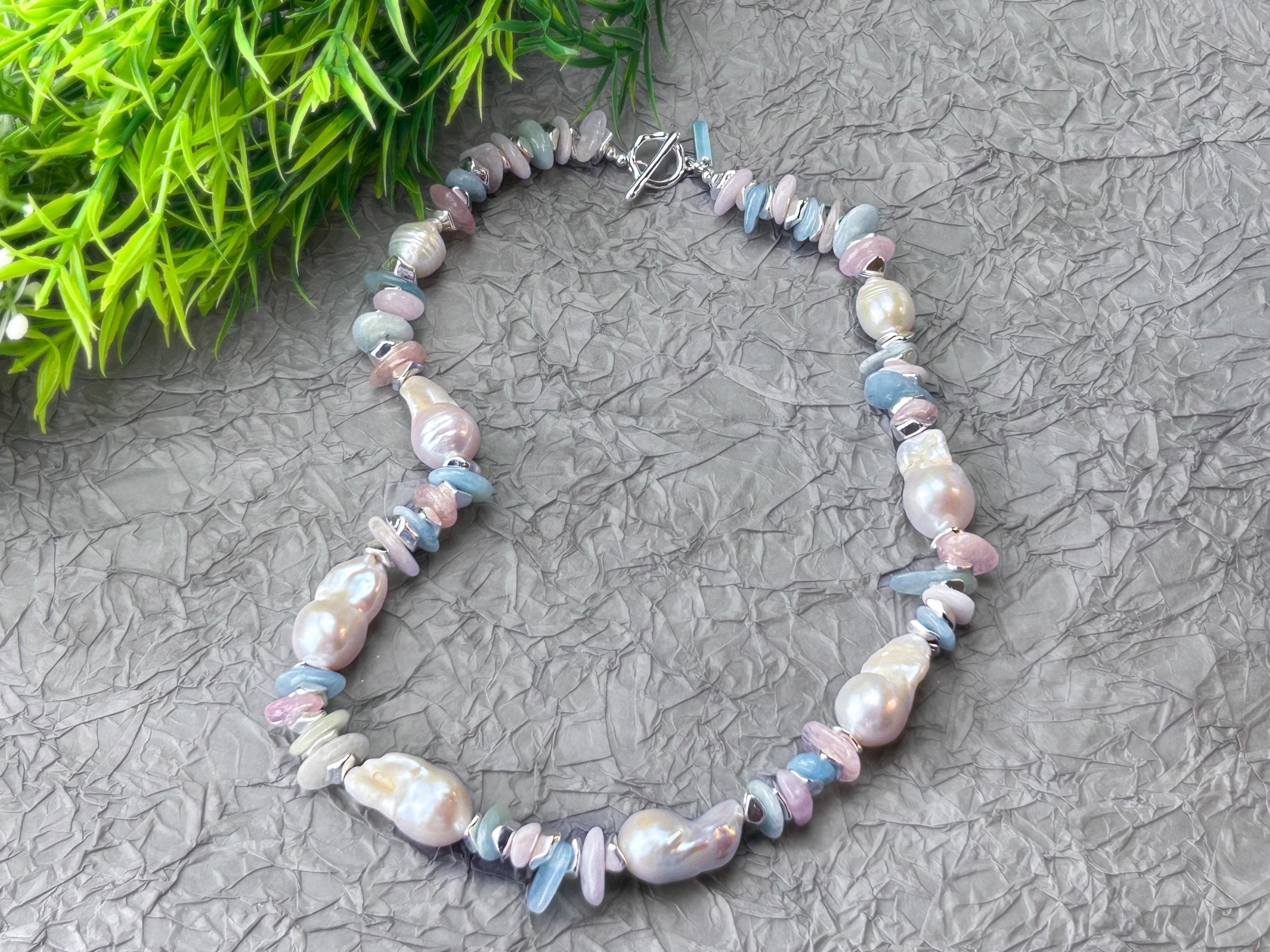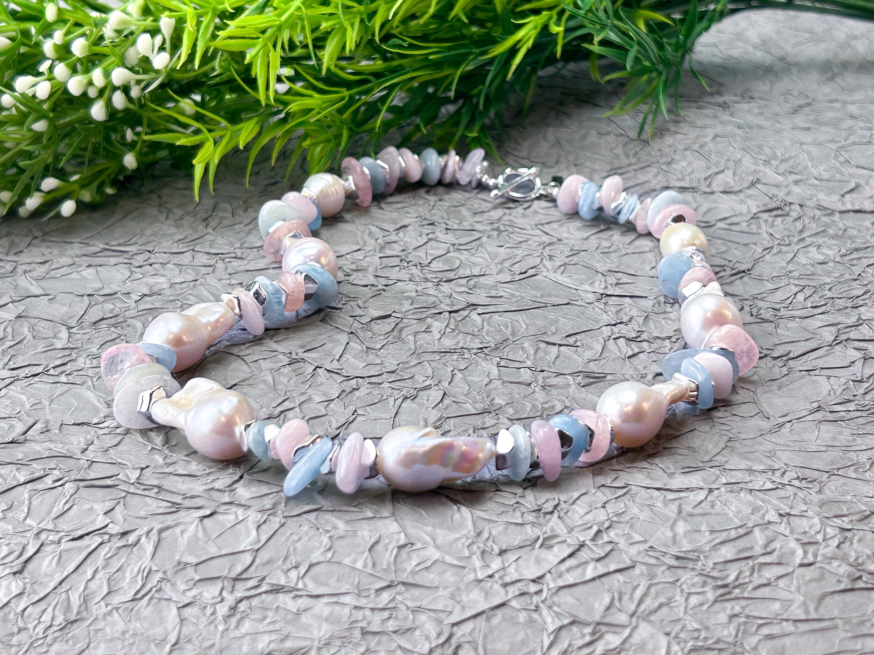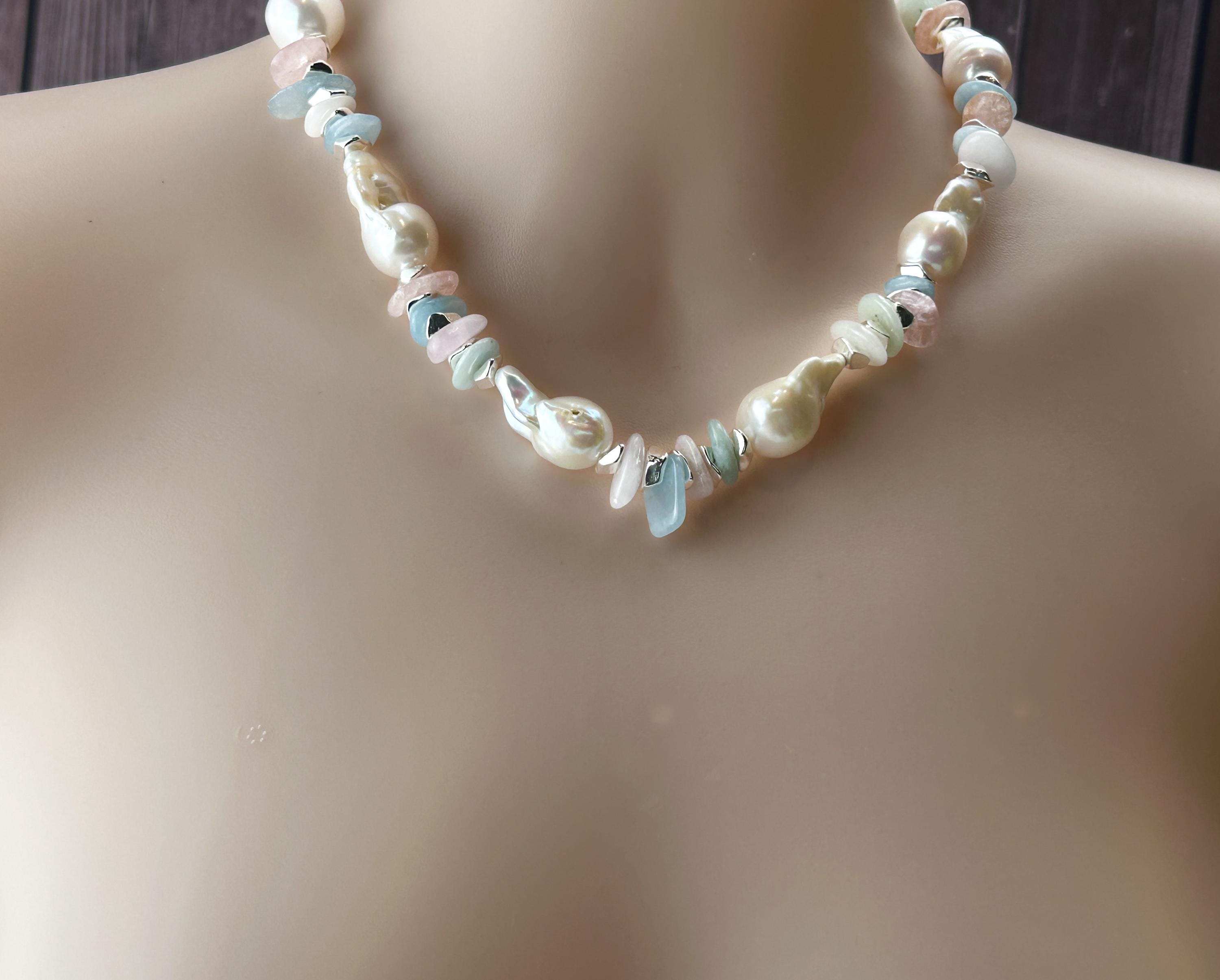 This elegant mixed gemstone necklace with baroque pearls, aquamarine, and morganite is a soft pink statement piece designed for everyday wear. The delicate combination of natural gemstones and organic pearls creates a romantic boho-inspired jewelry piece that complements both casual and elegant outfits. With its feminine color palette and timeless style, this necklace makes a meaningful gift for women, birthdays, anniversaries, or special occasions. ✨