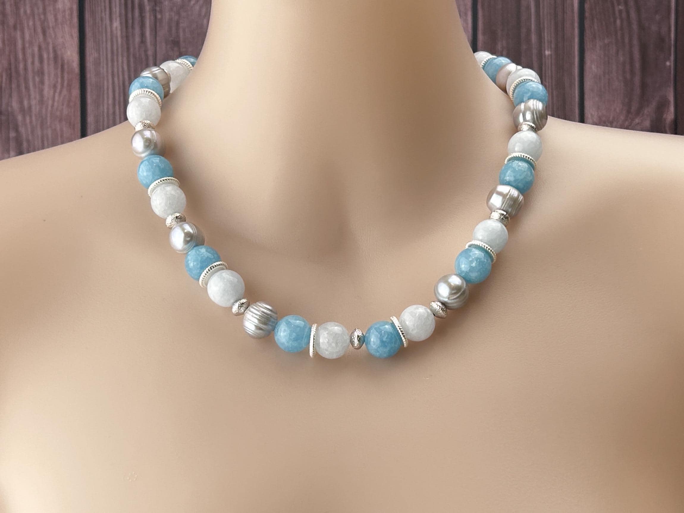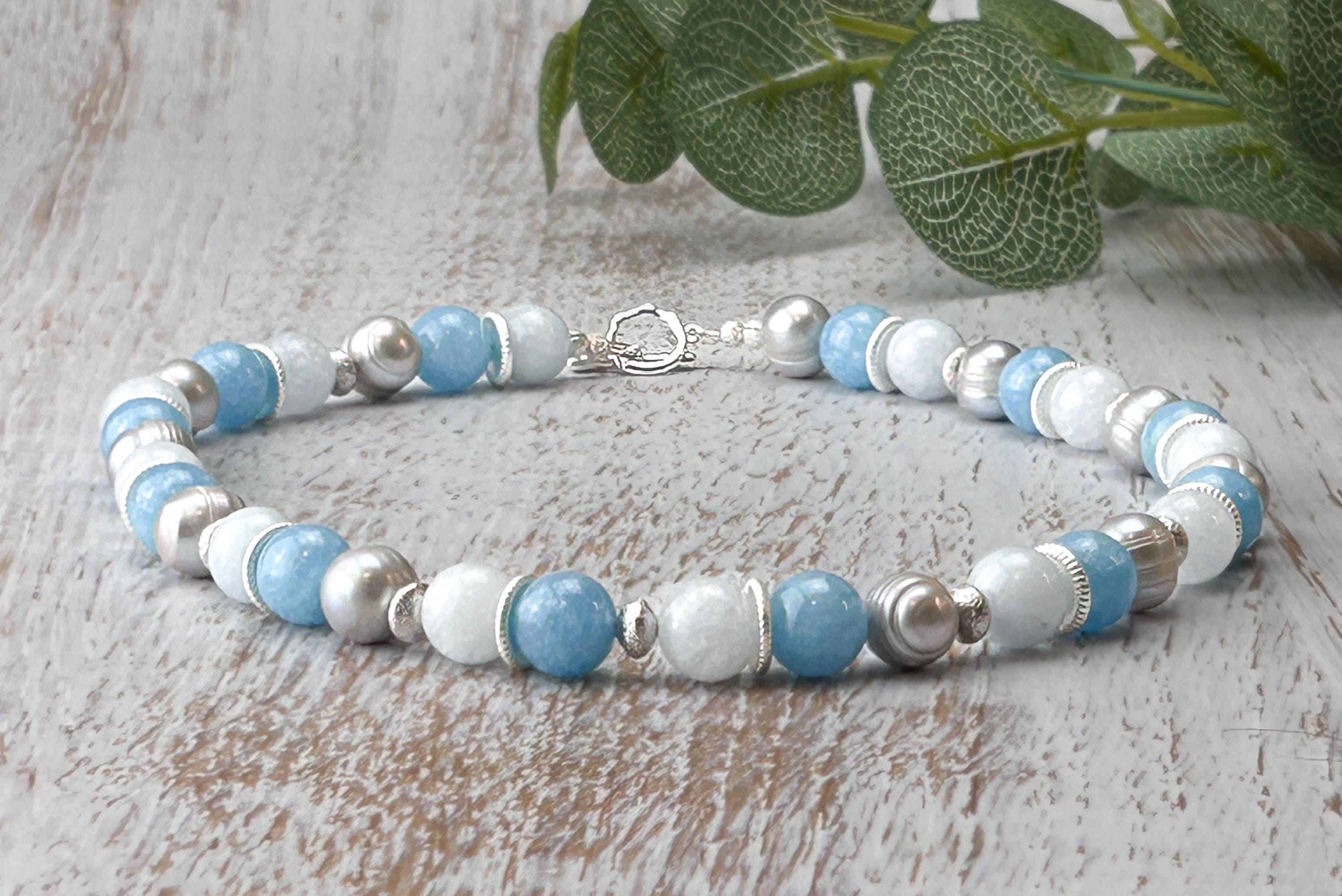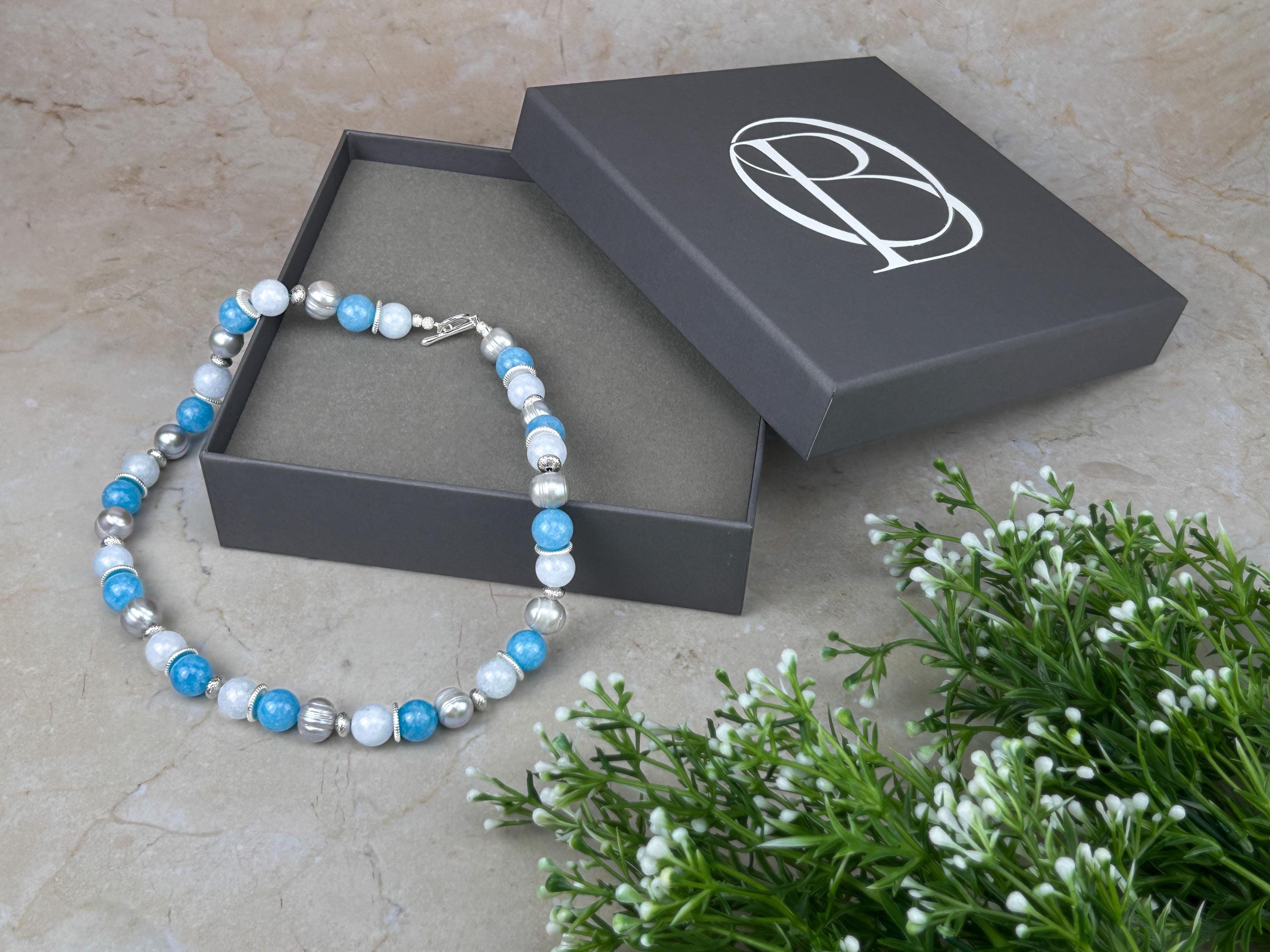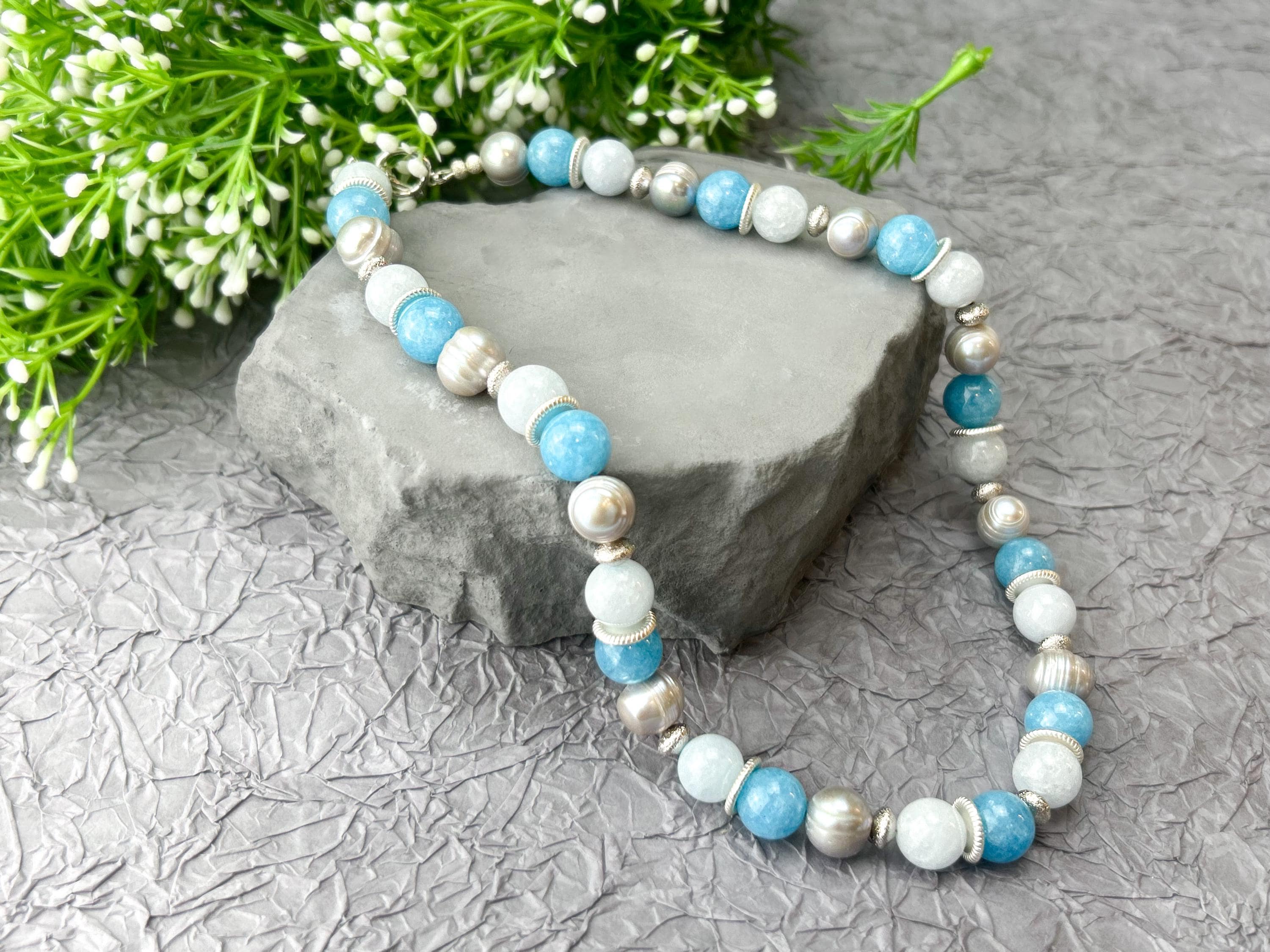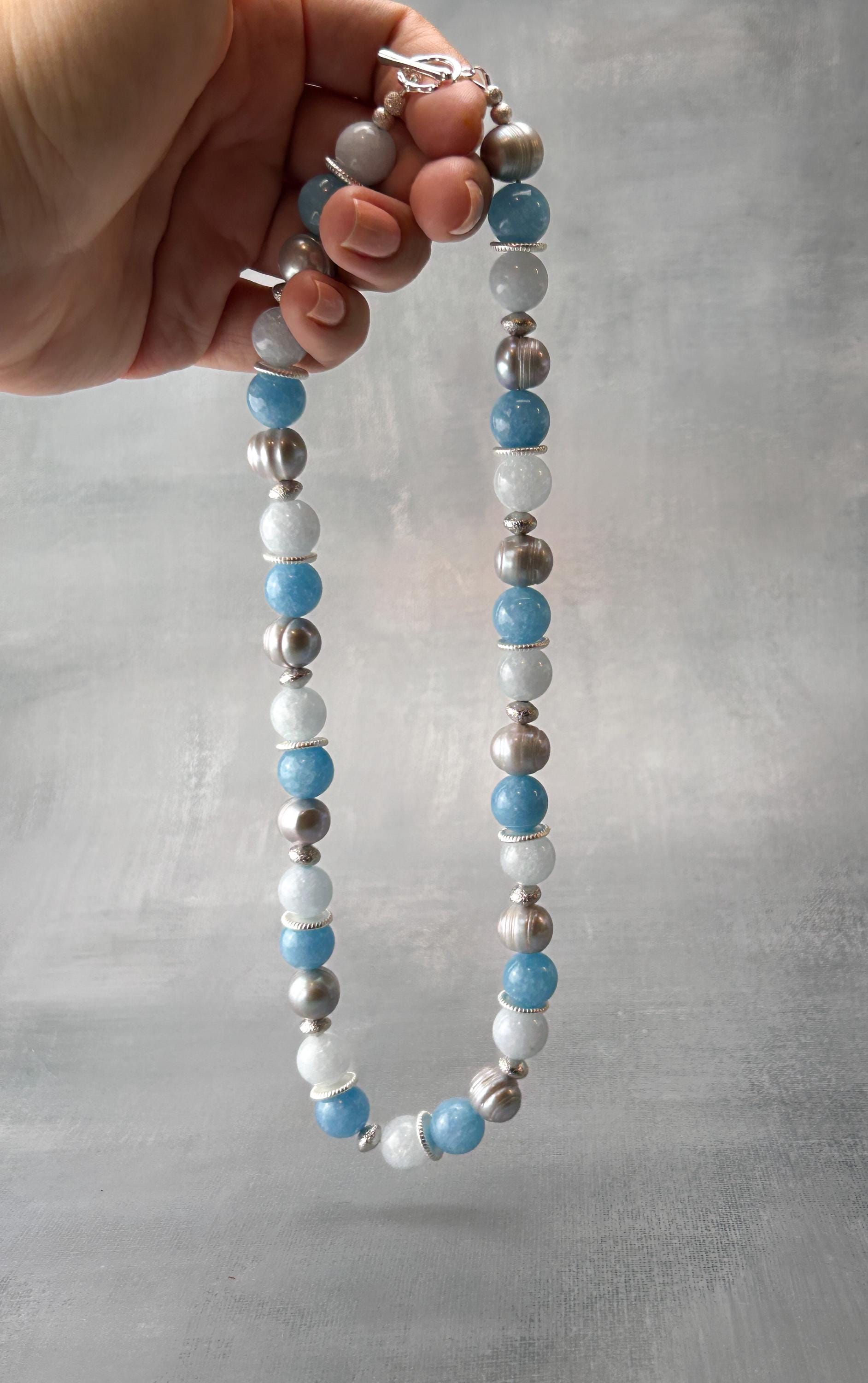 Bring calm, ocean-inspired beauty to your style with this elegant gemstone choker 💙🌊 Handcrafted from two shades of blue quartz beads and soft grey freshwater pearls, this piece offers a perfect balance of color and sophistication. Silver-plated spacers add a polished touch, making it ideal for both everyday wear and special occasions. Effortlessly chic and timeless, this choker is a versatile must-have for any jewelry lover.