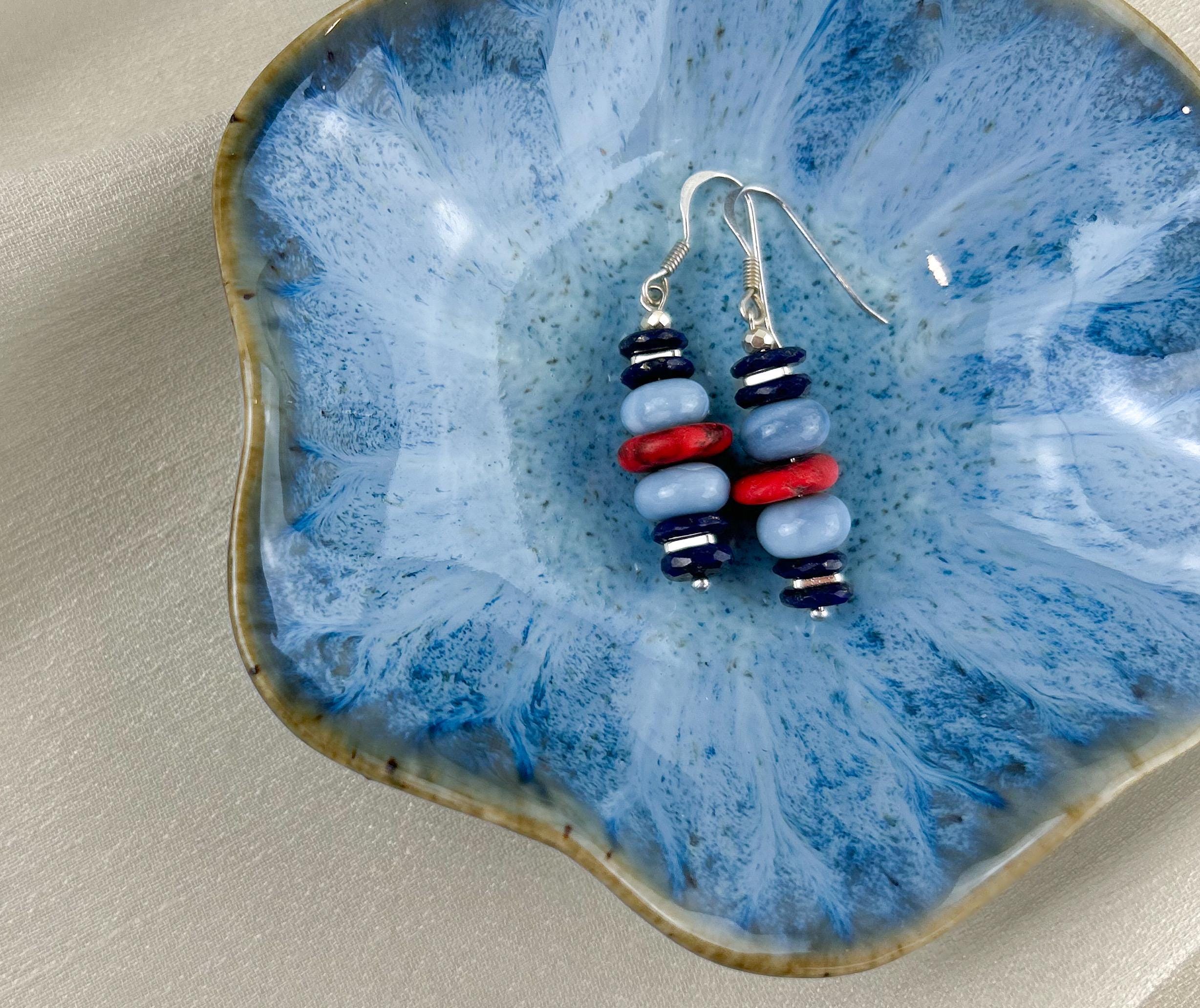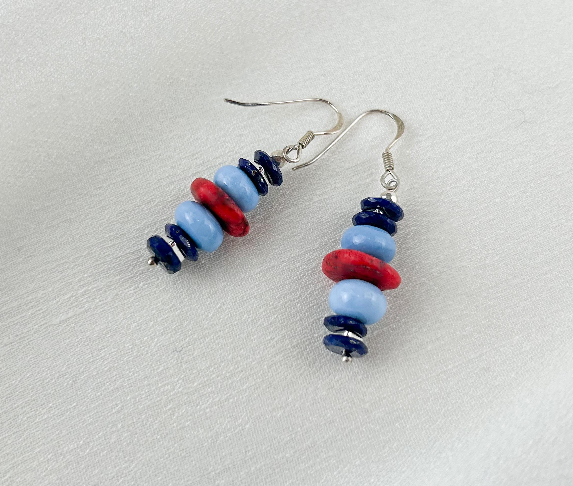 Brighten your style with these colorful natural gemstone earrings featuring a vibrant mix of blue opal, deep lapis lazuli, and bold red turquoise. Designed for both modern elegance and everyday wear, these dainty dangle earrings bring a playful yet refined touch to your look. Hypoallergenic 925 sterling silver hooks ensure comfort and safety for sensitive ears. 💙❤️✨