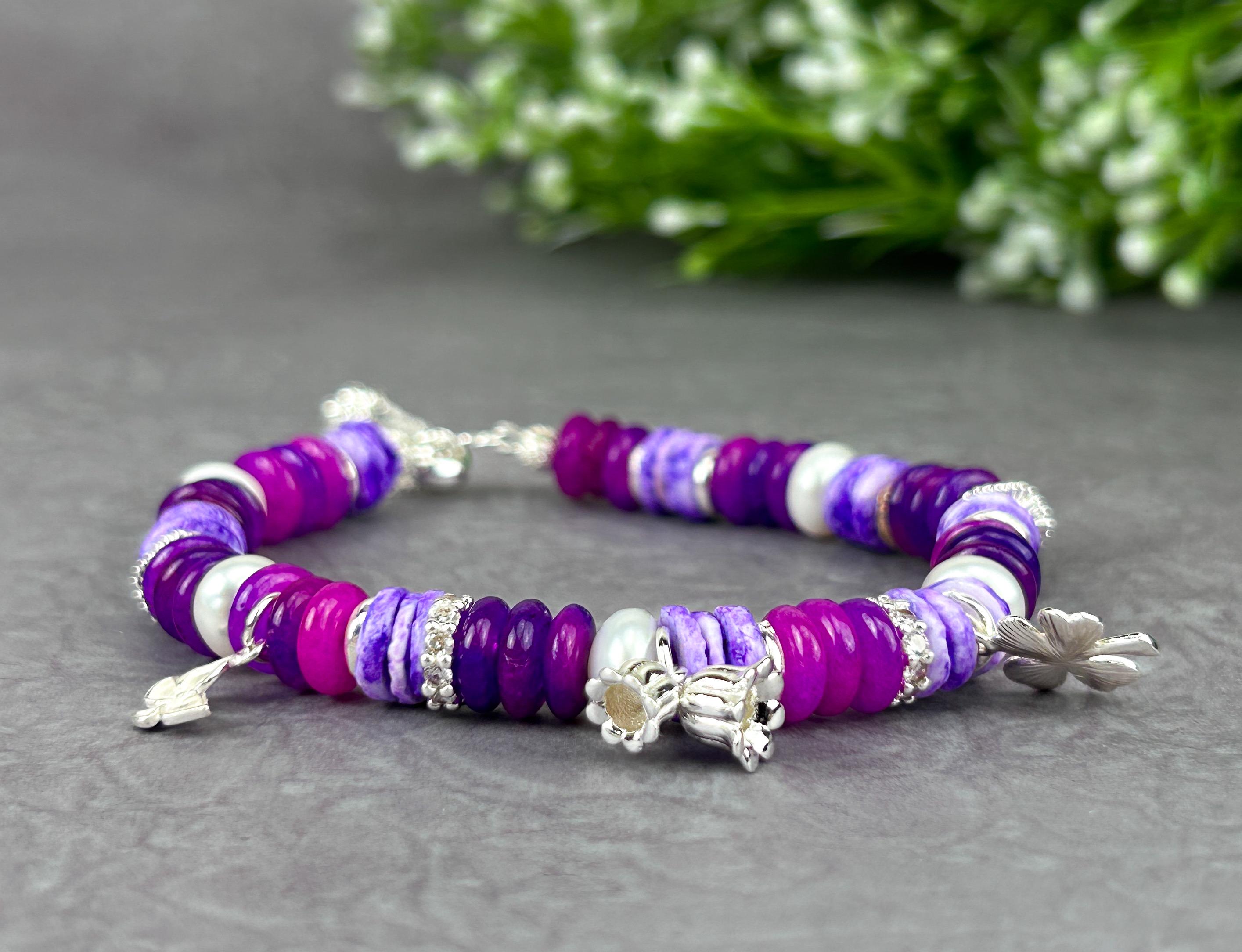 A delicate and elegant multi gemstone bracelet designed in a boho-inspired style, featuring a harmonious blend of sugilite, freshwater pearls, shell beads, and sparkling silver plated CZ pave charms.