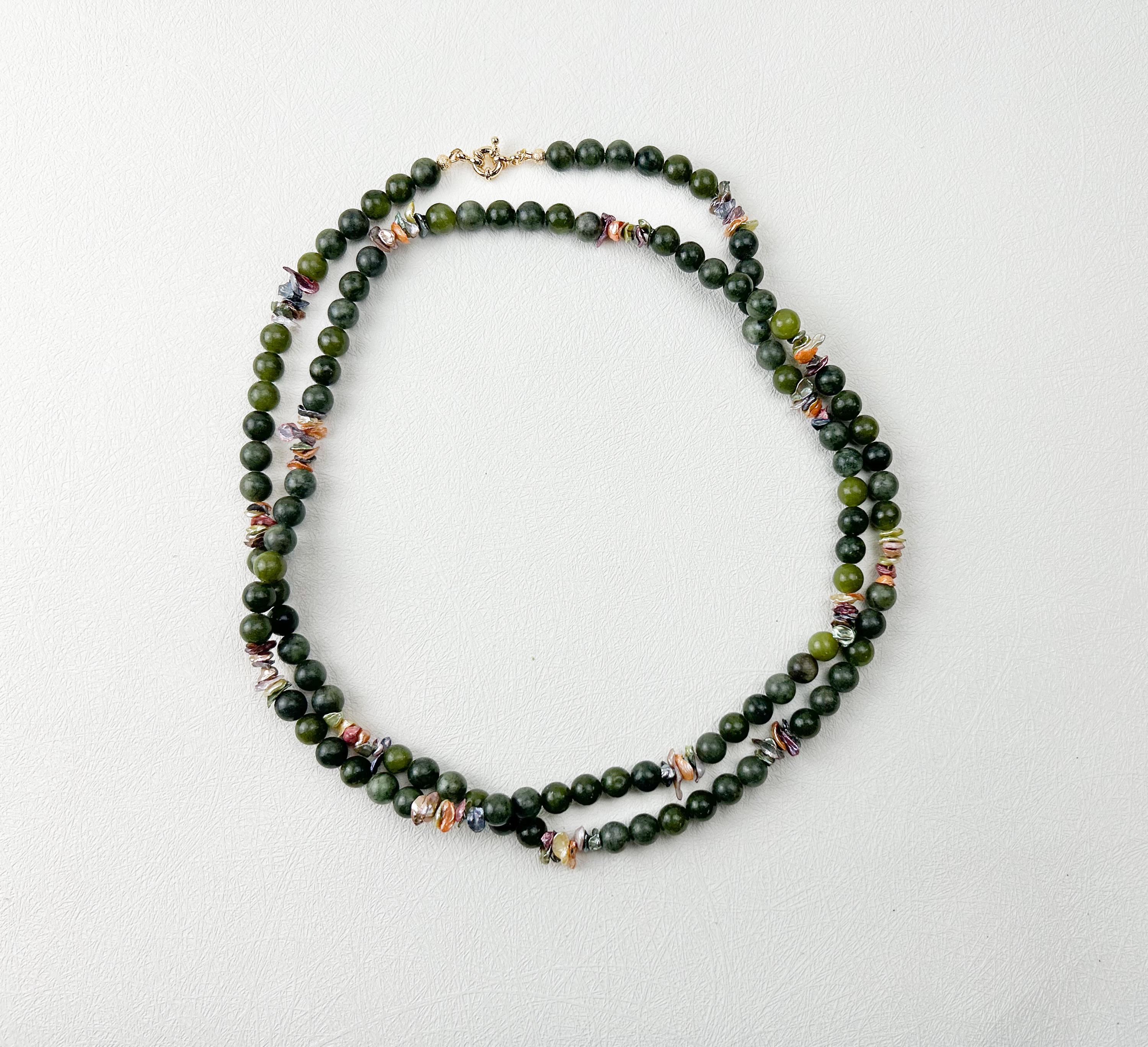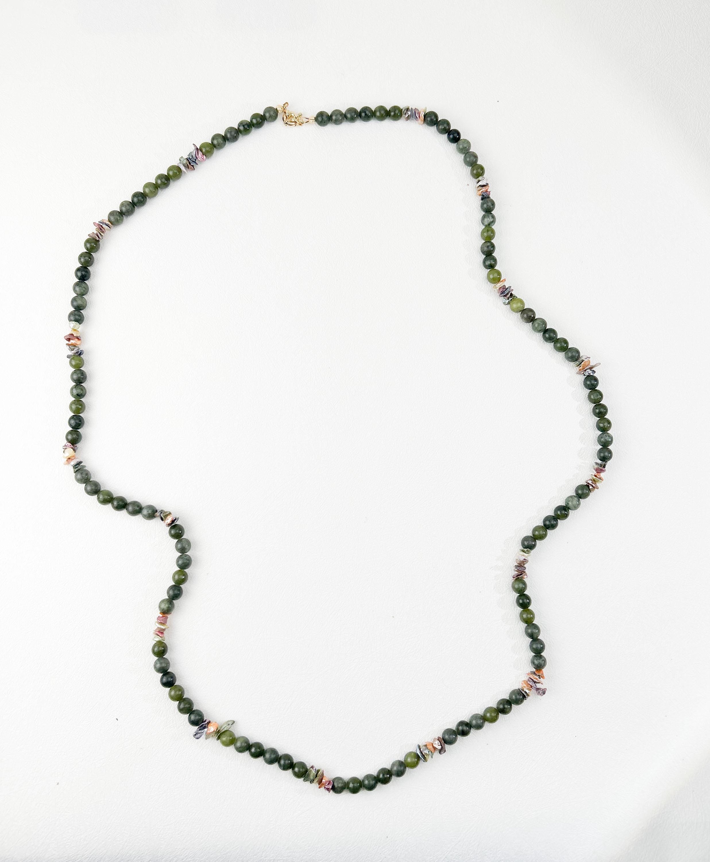 A refined long gemstone necklace featuring olive green Canadian jade and lustrous multicolored keshi pearls, designed for a modern boho aesthetic and effortless layering.