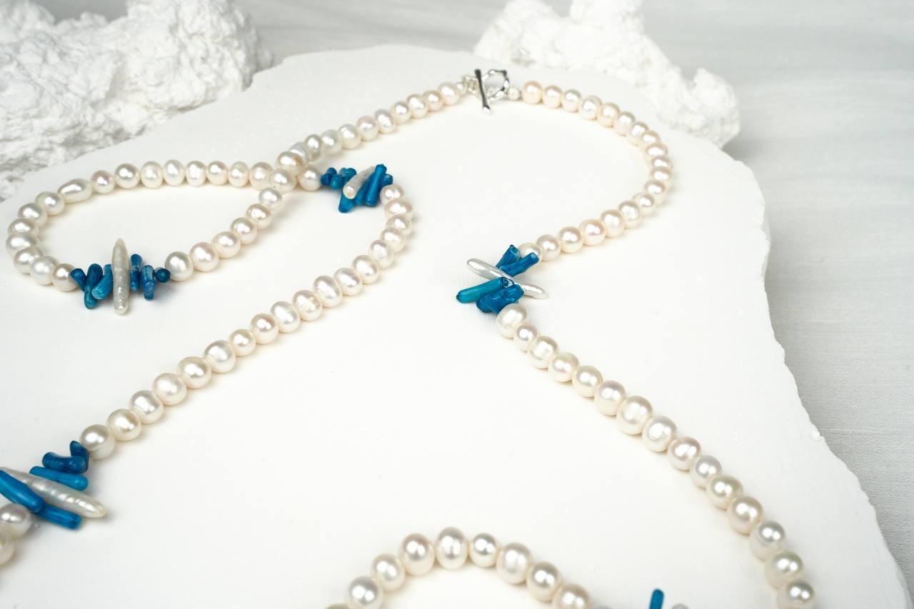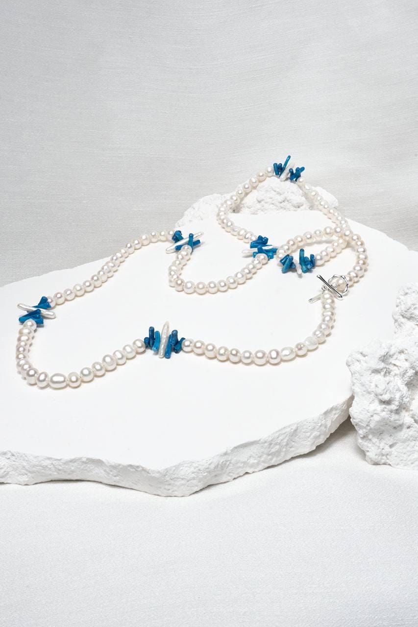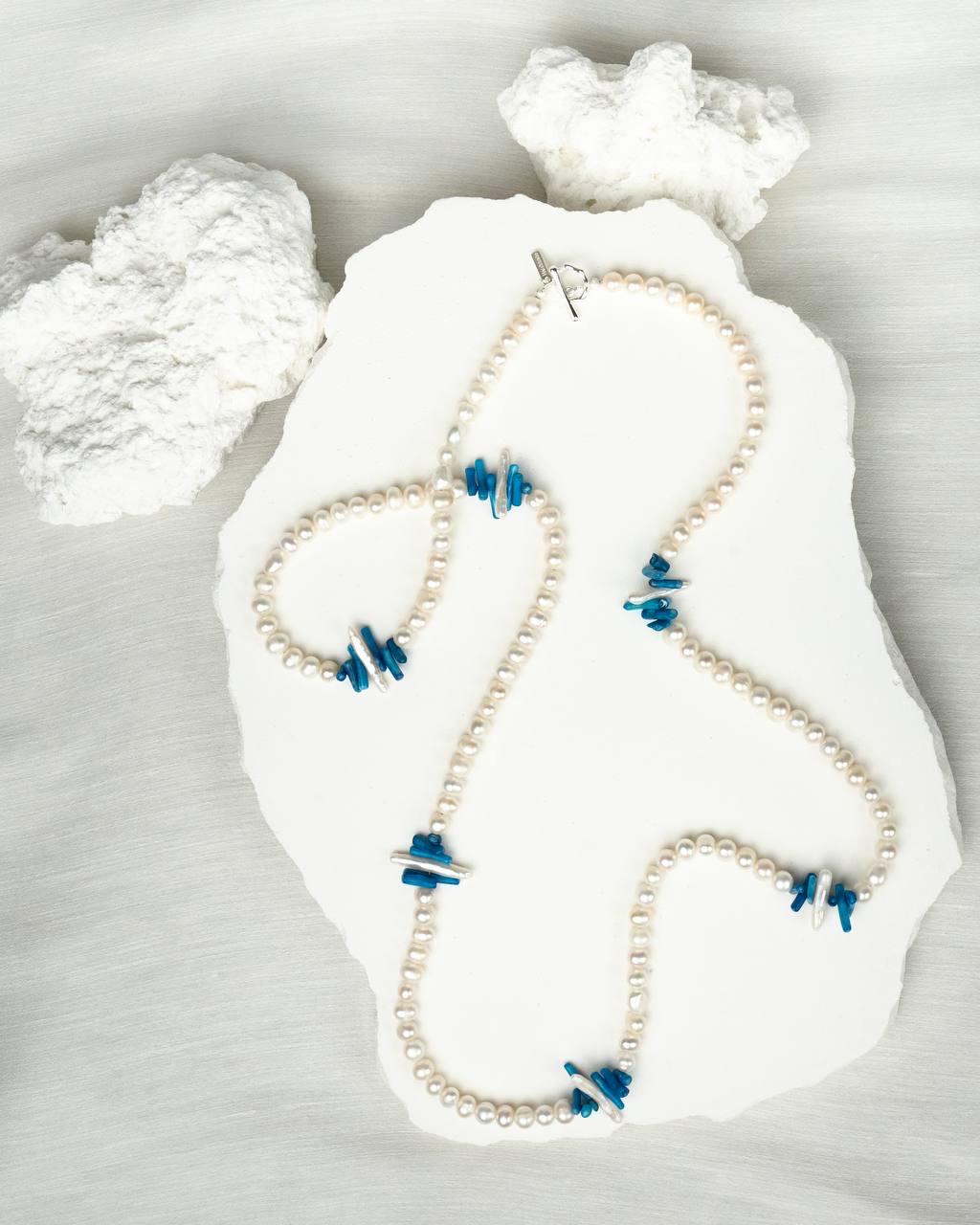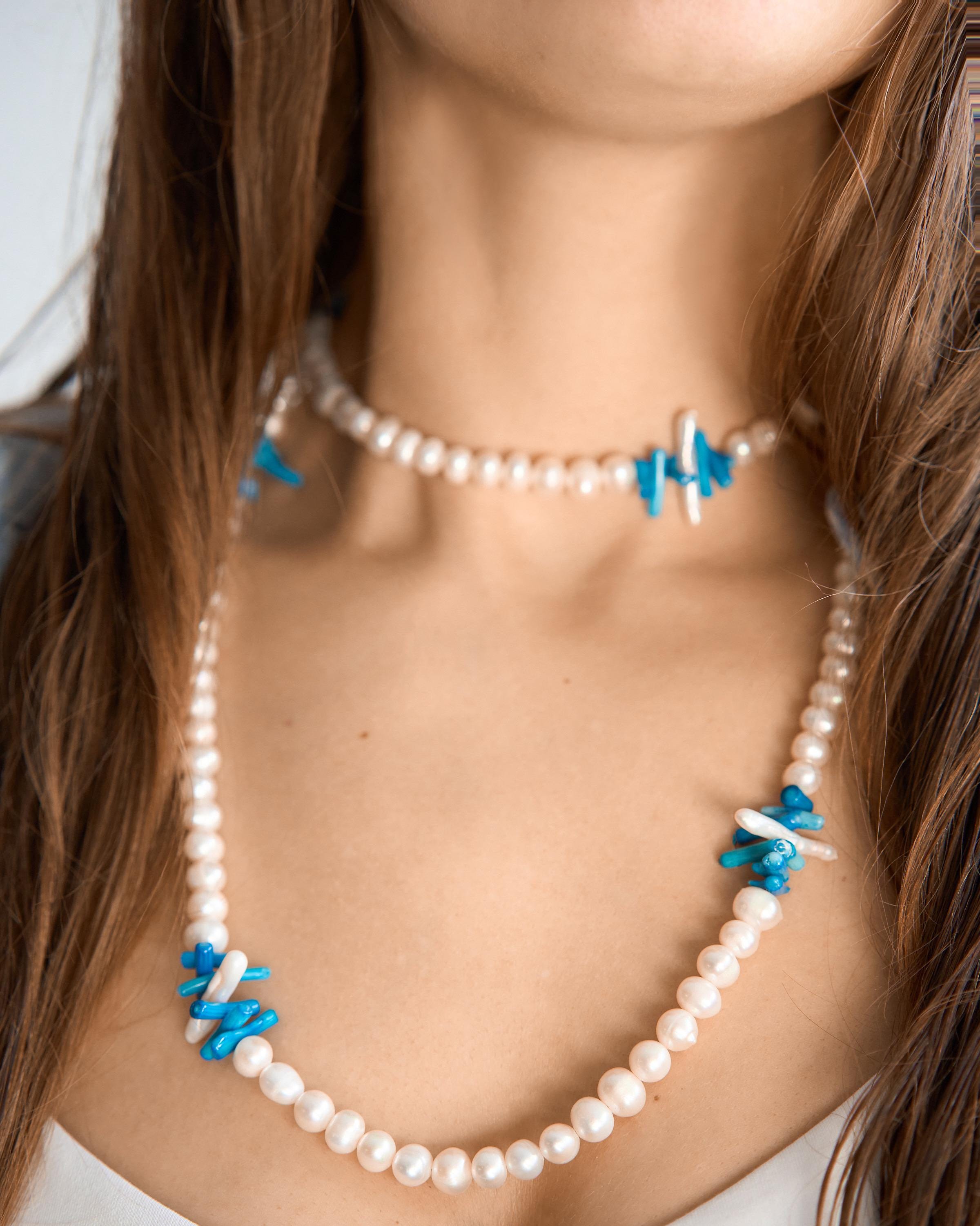 A stunning beaded gemstone necklace featuring vibrant blue coral beads paired with delicate pearls, designed for effortless boho chic styling and versatile layering looks.