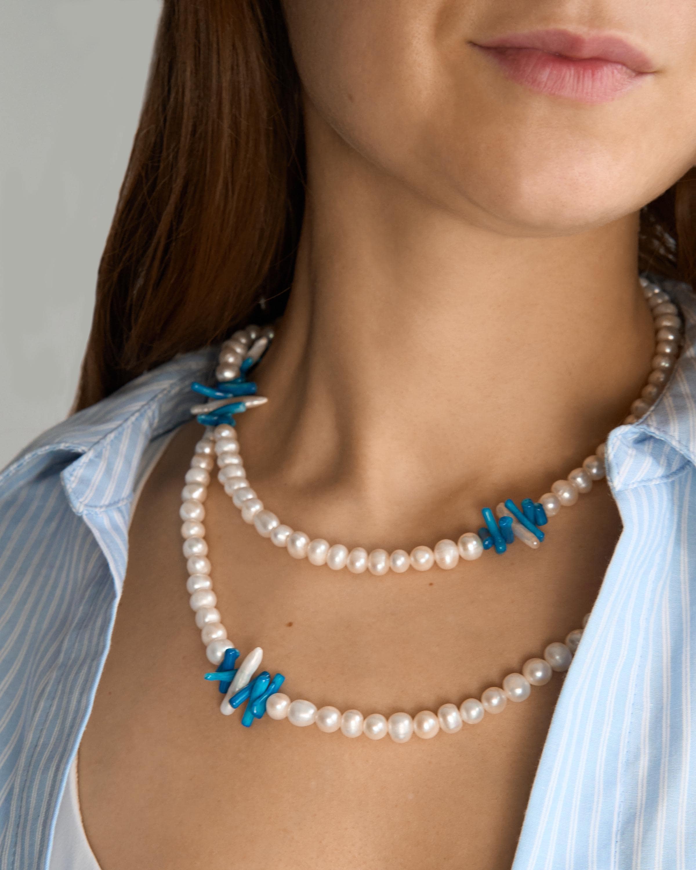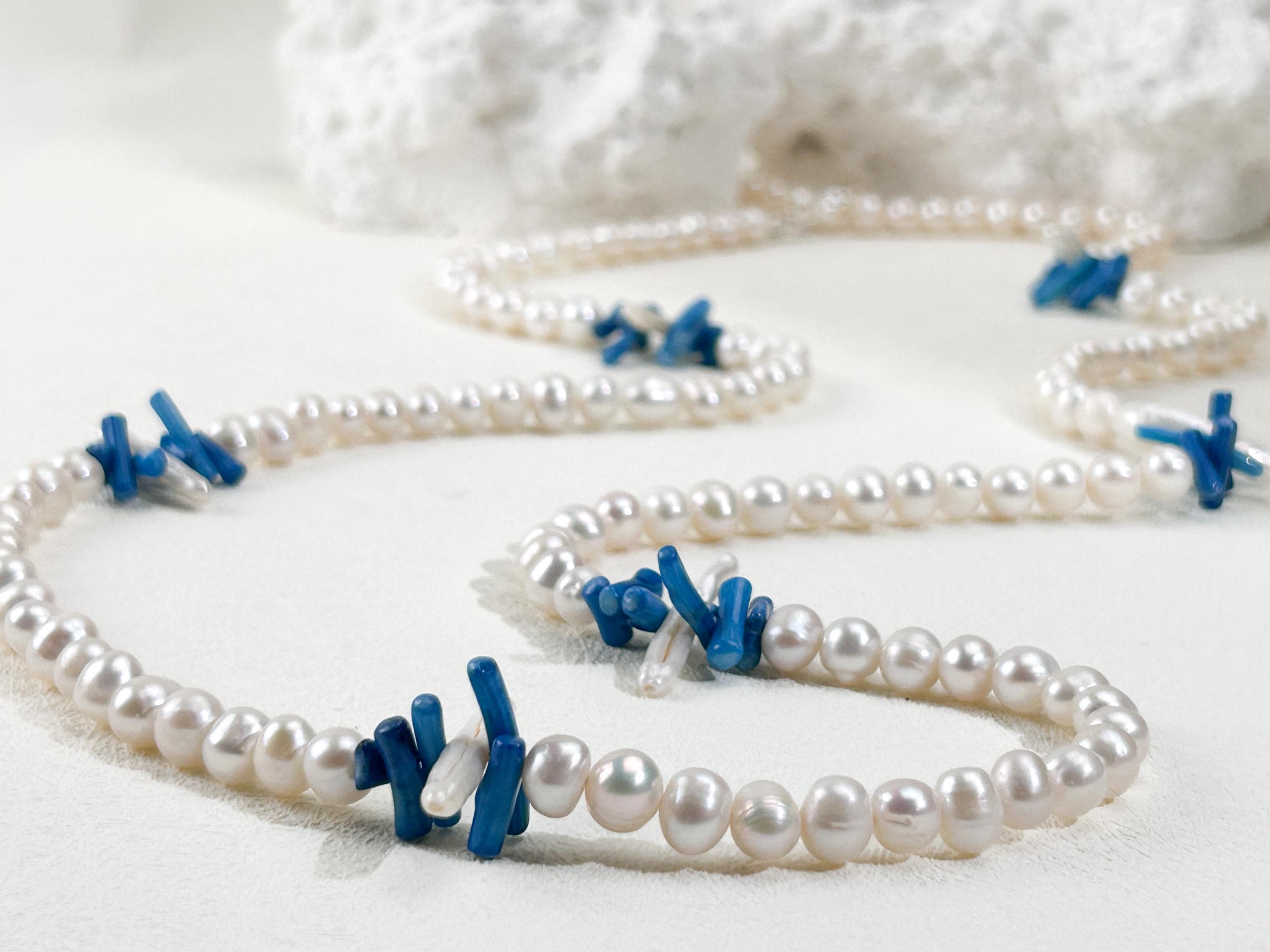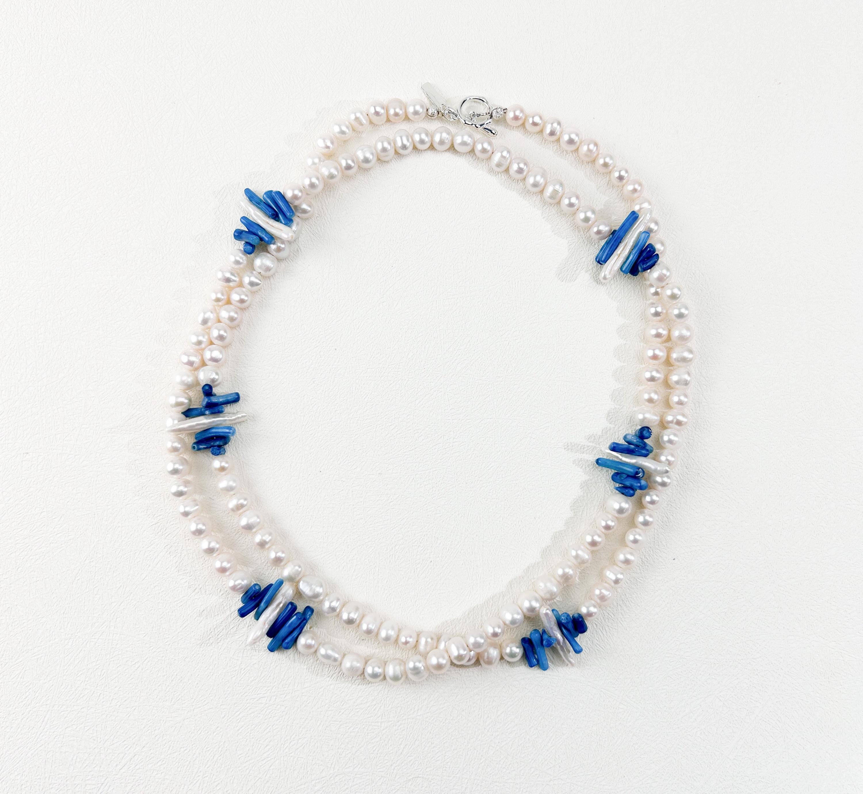 A stunning beaded gemstone necklace featuring vibrant blue coral beads paired with delicate pearls, designed for effortless boho chic styling and versatile layering looks.